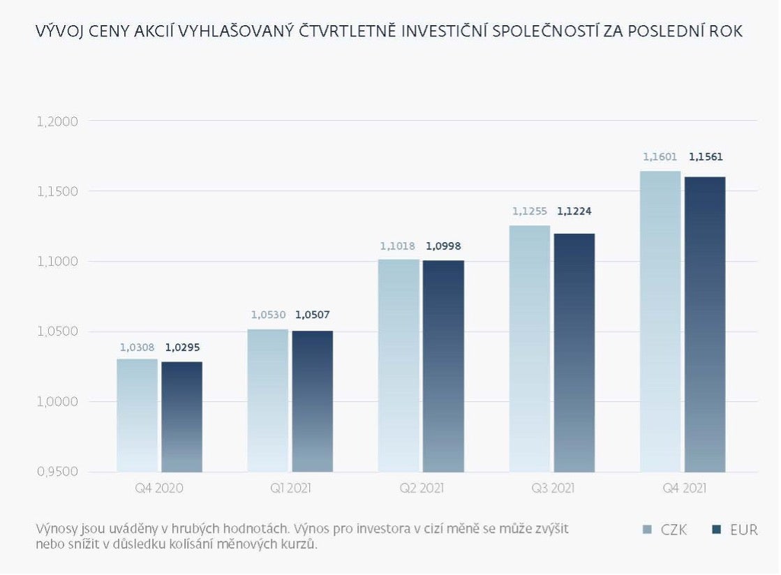 Za poslední kvartál se obě investiční třídy akcií zhodnotily přibližně o tři procenta. Za posledních dvanáct měsíců se pak hodnota vlastního kapitálu připadajícího na jednu investiční akcii zvýšila o 12,54 % v případě korunové třídy, respektive o 12,29 % v případě té eurové. Hodnota jedné akcie tak k 31.12. 2021činila 1,601 Kč, potažmo 1,1561 eur.